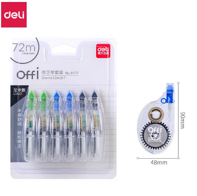 包装清单: | 得力(deli)8177 修正带 顺滑不断带 12m/个 6只/卡 * 1 |