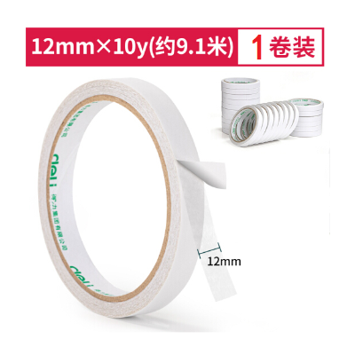 包装清单: | 得力(deli) 高粘性棉纸双面胶带 12mm*10y(9.1m/卷) 24卷/袋 30401 单卷装 |