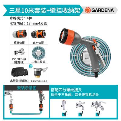 | 包装清单: | 嘉丁拿(GARDENA) 4模式 园艺浇花洗车喷头 多功能花园洒水枪 10米套装+挂架 |
