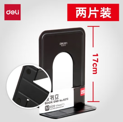 包装清单: | 得力(deli)9272 铁书立 17.5*17cm 黑色 2片/付 |