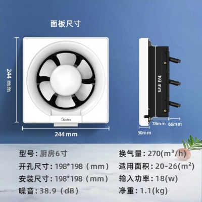 包装清单: | 美的(Midea)换气扇6寸百叶窗扇强力大风量 厨房6寸墙式吸油 APB15-3-BY 风量270 * 1 |