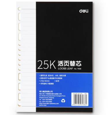 包装清单: | 得力(deli) 7938 象牙白活页替芯(深蓝)-90页-A5(本) |