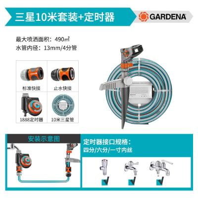 包装清单: | 嘉丁拿(GARDENA) 地插式摇臂喷头360度自动旋转喷灌园林浇水洒水器淋菜 15米四分管套装(接四分水龙头) |