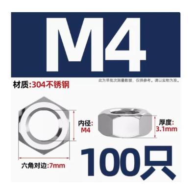 商品名称:304不锈钢201六角螺帽螺栓大全 M4 100粒 304材质 |