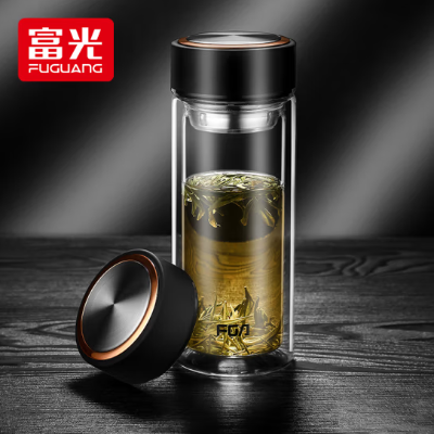 富光 双层玻璃杯 简约304不锈钢茶隔水杯 320ML 格调雅黑
