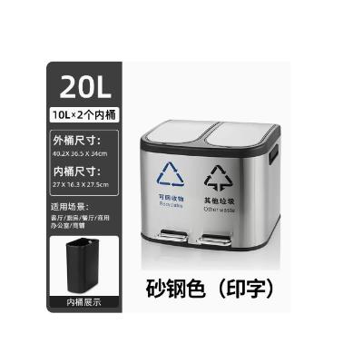 包装清单: | 世明 分类垃圾桶 不锈钢大容量家用厨房客厅 大号脚踏式 带盖干湿分类 20L 不锈钢分类 砂钢色 印标 * 1 |