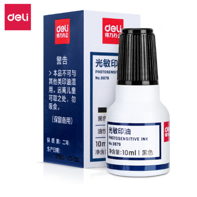 包装清单: | 得力(deli) 9879 财务印章光敏印油 10ml 黑色 |