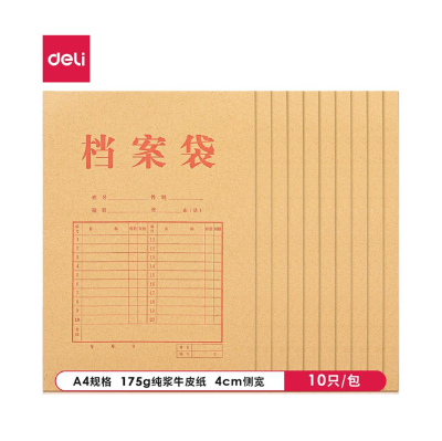 包装清单: | 得力(deli) 5952 A4纯浆175g牛皮纸档案袋 侧宽3cm 10只/包 |