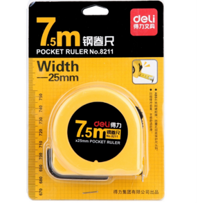 包装清单: | 得力(deli) 8211 高精度钢卷尺 木工尺装修测量 7.5m 带英寸 *1 |