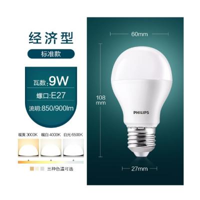 包装清单: | 飞利浦(PHILIPS)LED灯泡节能灯泡球泡灯大螺口 E27 经济型灯泡 9W 6500K 日光色 单支装 |