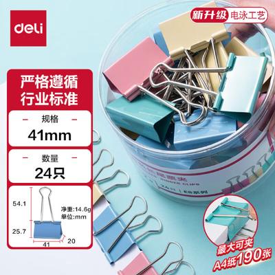 包装清单: | 得力(deli)24只41mm彩色长尾夹票夹 2号大号金属燕尾夹票据夹子 24只/筒 8552ES |