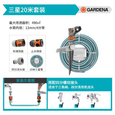| 包装清单: | 嘉丁拿(GARDENA) 地插式摇臂喷头360度自动旋转喷灌园林浇水洒水器淋菜 20米四分管套装(接四分水龙头) |