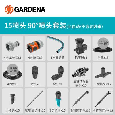 | 包装清单: | 嘉丁拿(GARDENA) 花圃花池自动喷淋浇水系统 无人值守定时浇花M4 15喷头-90°喷头套装 |