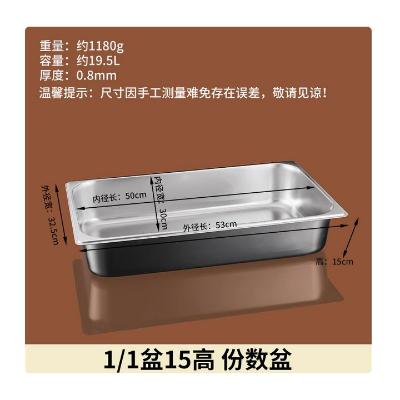 | 包装清单: | 不锈钢份数盆 1/1*15cm 高份数盆身【53X32.5X15】 *1 |
